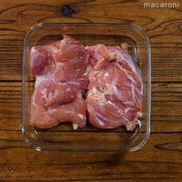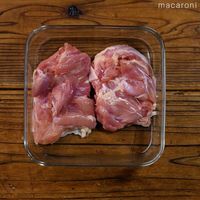 鶏もも肉は余分な脂肪と皮を取り除き、厚みを均一にして半分に切ります。
