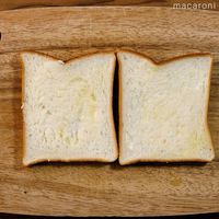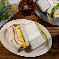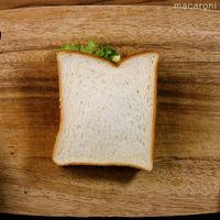 レタス、卵、チキンの順にのせ、もう1枚の食パンをのせてぎゅっと押さえます。