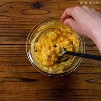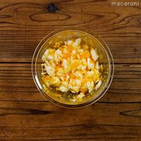 ボウルにゆで卵を入れ、フォークなどで粗く潰します。