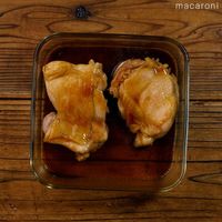耐熱容器に鶏肉の皮目を下にして入れ、④をかけます。