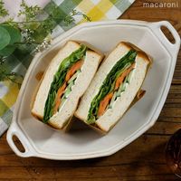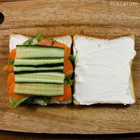 1枚の食パンの上にスモークサーモン、きゅうりをのせ、もう1枚の食パンをのせてぎゅっと押さえます。