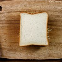 千切りキャベツ、⑦の順にのせ、もう1枚の食パンをのせてぎゅっと押さえます。