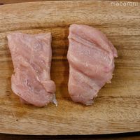 鶏むね肉を観音開きにして、半分に切ります。