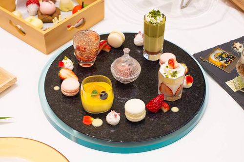 小田原産百花蜜を使ったゼリーやいちご、大山茶入りのパウンドケーキなどを巧みに組み合わせ、春らしい色合いときらめきを演出。