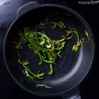 ピーマンを加えて炒め合わせ、色鮮やかになったら、酒・しょうゆ・砂糖を加えて汁気がなくなるまで炒めて、取り出します。