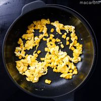 フライパンにバターを入れて溶かし、溶き卵、コーン加えて混ぜながら炒め、砂糖・塩で味付けして取り出します。