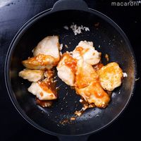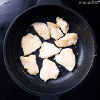 フライパンにサラダ油を熱し、鶏肉を入れて両面こんがりと焼き色がつくまで加熱します。