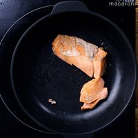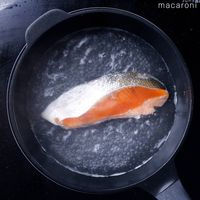 フライパンに鮭を入れて、ひたひたまで水(分量外)を入れて沸騰させ、中火で3分、裏返して3分ゆでます。