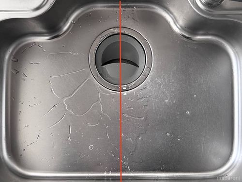 検証するのはキッチンのシンク。半分に分け、片側のみに撥水スプレーを吹きかけます。