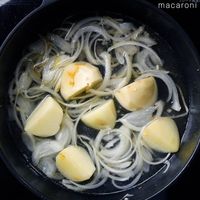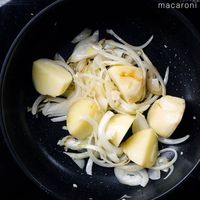 残りのサラダ油を引いて熱し、玉ねぎ、じゃがいも加えます。玉ねぎがしんなりするまで炒めます。