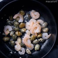 あさり、えび、白ワインを加えてフタをし、あさりの口が開くまで中火で加熱したら、汁ごと避けておきます。
