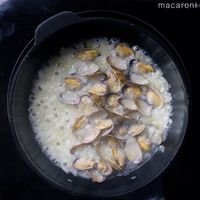 あさり、白ワインを加えてフタをし、あさりの口が開くまで中火で加熱します。