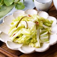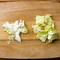 キャベツは芯と葉にわけ、葉は一口大に、芯は薄いそぎ切りにします。