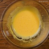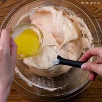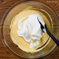 卵黄を混ぜたボウルにメレンゲの1/3量を加え、混ぜます。