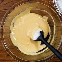 湯煎しておいたバターと牛乳に、生地をひとすくい入れてなじませ、生地に戻し、均一になるようさっくりと混ぜます。