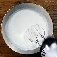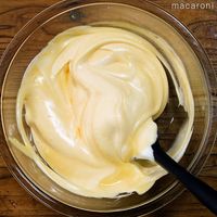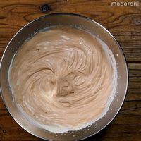 ⑧に⑨を大さじ2〜3杯分加えてなじませたら、生クリームのボウルに加えて全体を混ぜ合わせます。そのまま泡立てて八分立てにします。