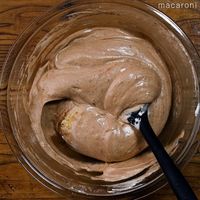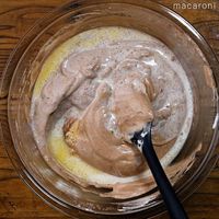 薄力粉、ココアパウダーをふるい入れ、ゴムベラで切るように混ぜます。