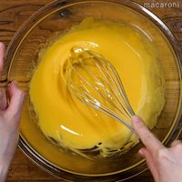 ボウルに卵黄、グラニュー糖を入れ、泡立て器で白っぽくもったりするまですり混ぜます。