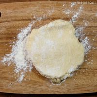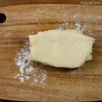 まな板に打ち粉をして、めん棒で厚さ2cmにのばします。