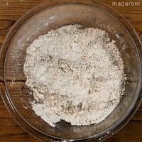 バターを加え、両手でこすり合わせながらポロポロの状態になるまで混ぜます。