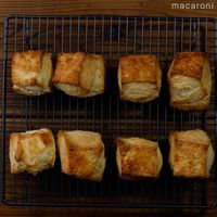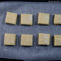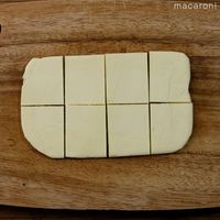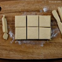打ち粉をした台にのせ、生地を厚さ1.5cmに伸ばして正方形に切ります。残った生地をまとめてのばし、四角く整えます。