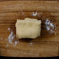 まな板に打ち粉をして、めん棒で厚さ2cmにのばします。生地を半分に切っては重ねてを3〜4回繰り返して、層をつくります。