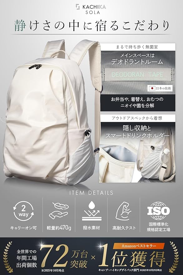 26Lのリュックを通勤メインで使うなら、機能を重視。KACHIKAの「SOLA」は、これまでのリュックの常識をくつがえした「デオドラントルーム」が搭載されています。お弁当や汗をかいた着替えの臭いも気になりません。