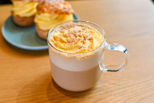 エスプレッソとミルクにバニラ風味のミルクキャラメルソースを合わせて、カスタードフレーバーホイップとシュー生地風クランチをのせた1杯です。