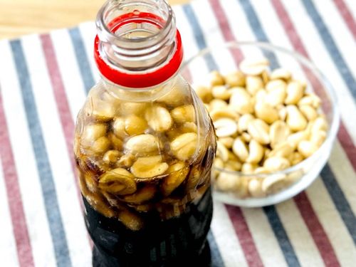 手順はとても簡単。まずはコーラを少し飲んでスペースを空け、そこにピーナッツを入れるだけです。