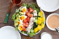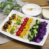コブサラダは主に、葉ものの野菜の上に鶏肉やトマト、アボカド、ゆで卵、キュウリなどが角切りで盛られています。材料に定義はないので、自宅の冷蔵庫にある残り物や好きな食材で作ってみましょう。