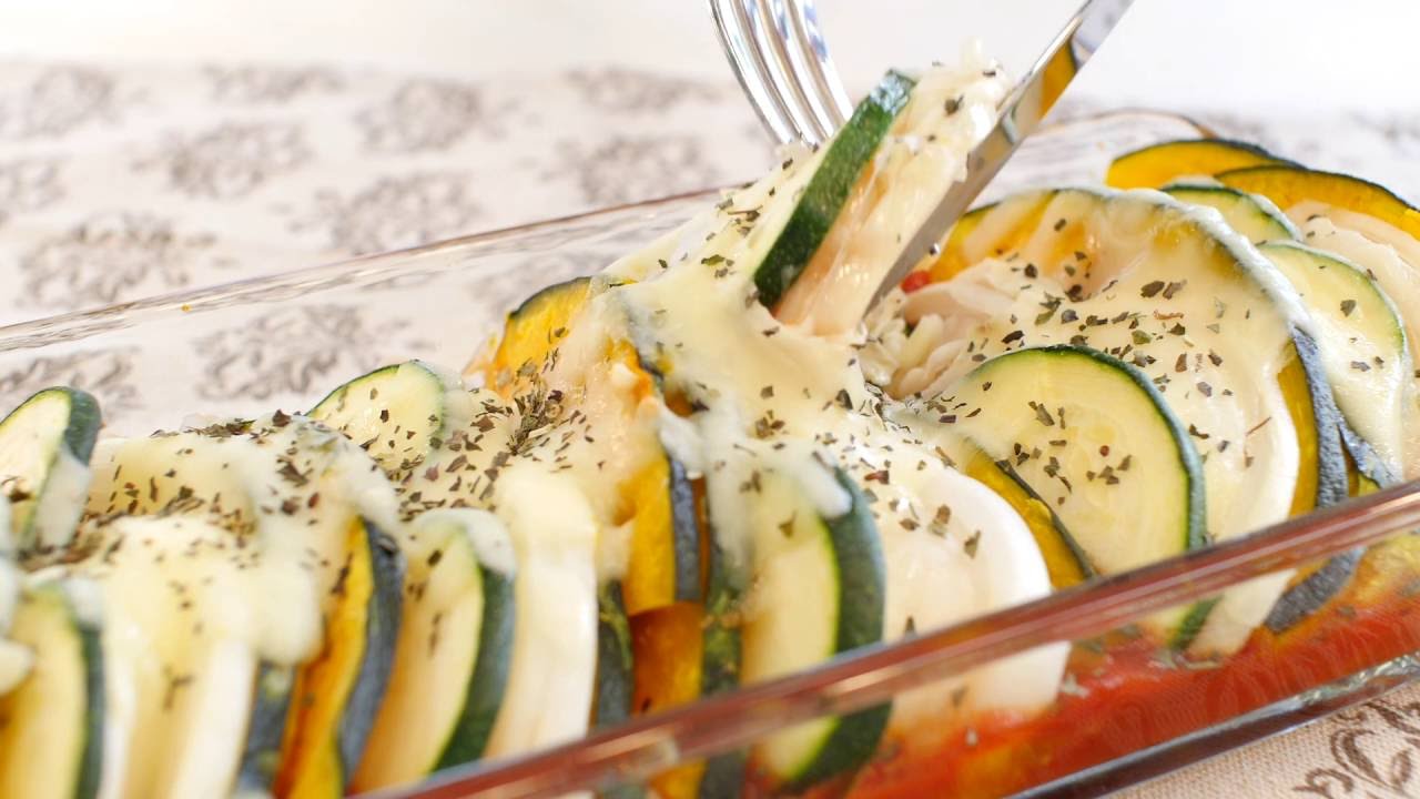 赤・黄・緑のカラフルなカラーに食欲をそそられる、ゴージャスなサイドディッシュ。かぼちゃの甘み、玉ねぎとズッキーニの食感、とろけるチーズのコクがトマトソースと混ざり合い、味わい豊かな旨みが口いっぱいに広がります。