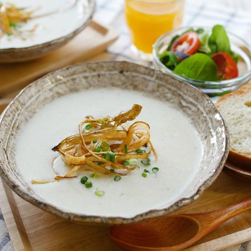ごぼうや玉ねぎなどのでんぷん質が少ない野菜をポタージュに使用するときは、ごはんを加えると自然にとろみがつきます。あわせて、なめらかでやさしい味わいに仕上がるのでおすすめですよ。