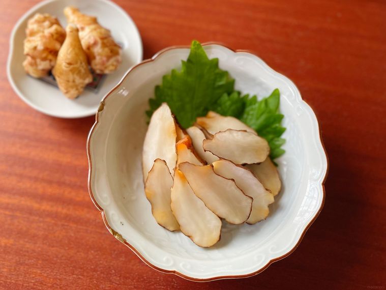 ちくわの穴に、野沢菜漬けを詰めるだけの簡単な作り方。上から白いりごまを散らして、マヨネーズを添えます。切り口断面の彩りが良いうえ、きゅうりを詰めるよりも味がしっかりしていて、おいしさも文句なしです。
