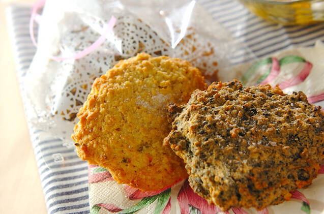 薄力粉の量を抑えておからとオートミールを使う、健康志向の方向けのひと品です。ベースの生地を作り、そのあとにごま風味・ハーブ風味・ジンジャー風味の3種類に分けます。プレーンな生地は、ほかにもチョコレート・抹茶風味など、さまざまなアレンジができますよ。