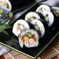・酢、塩、砂糖を混ぜ合わせ、ごはんに加え、あおいで粗熱を取りながらしゃもじで切るように混ぜて酢飯を作ります。