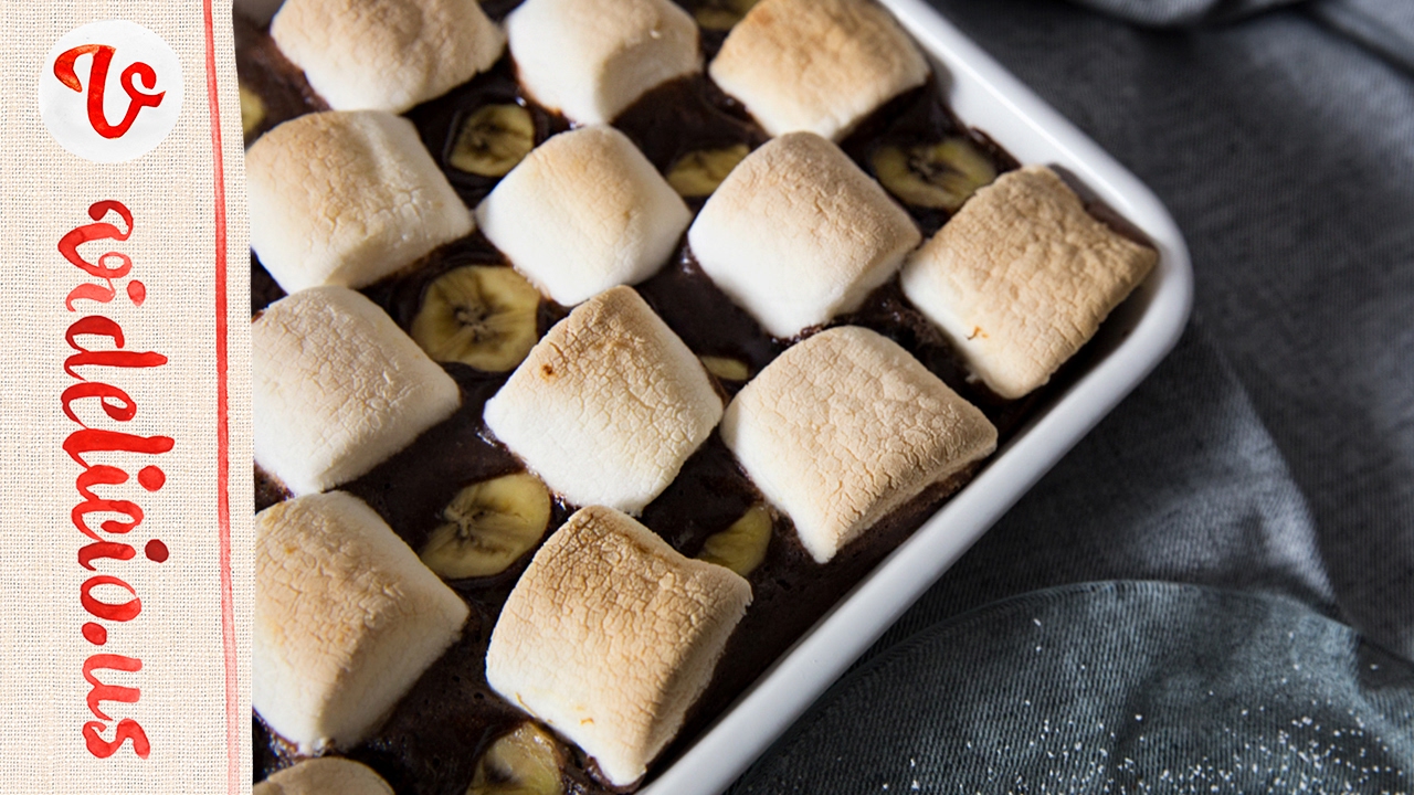 バットで作る簡単バナナスモアケーキ♩すごく甘そうに見えるスモアケーキですが、今回のレシピはちょっと甘さをおさえ、甘さよりも食感を楽しめるケーキになっています!