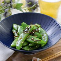スナップエンドウを色鮮やかに仕上げるには、「ゆでるときに塩を入れること」と「ゆで上がったら冷水に取ること」がポイント。塩を入れると緑色が鮮やかになり、冷水に取ることで色止めができ、ツヤが出ますよ。冷水に取らずにザルにあげたままにしておくと、シワが寄り色がくすむので注意してくださいね。