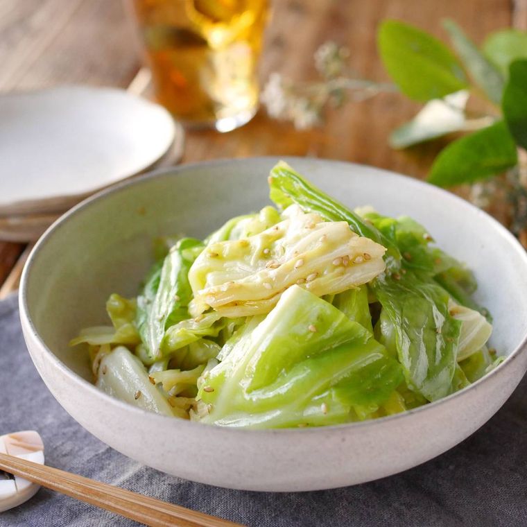 電子レンジを使うお手軽レシピです。キャベツは加熱することで甘味が増し、ゆで卵やかつおぶしの旨味ともよく合いますよ。マヨネーズに白すりごまを加える濃厚な味わいが、キャベツのおいしさを引き立てますよ。