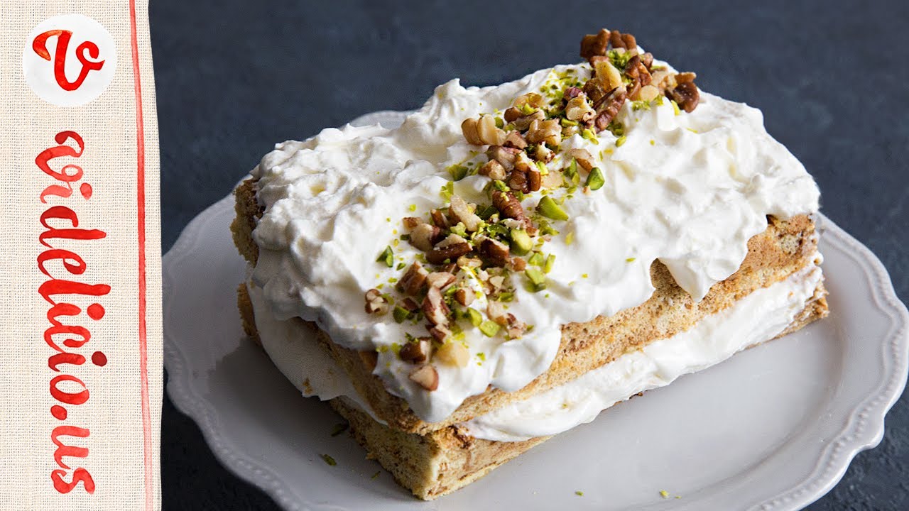 11. 重ねたスポンジ生地にも多めにクリームをのせ、ナッツやピスタチオをふりかける。