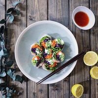 お酢、砂糖、塩をお鍋でひと煮立ちさせ、冷ご飯と混ぜ合わせ、酢飯を作ります。ボウルにその他の調味料を入れ、牛肉と人参を加えて10分漬け込みましょう。フライパンでお肉を焼き、酢飯を使ってロール状にしてできあがり。