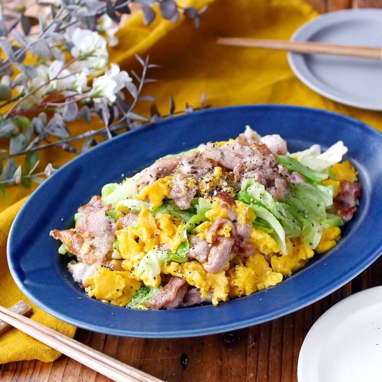 キャベツはあと入れでサッと蒸し焼きにして、シャキっとした歯ごたえを残すのがポイント♪ 卵から香る、ごま油とマヨネーズの風味が食欲をかき立てます!ジューシーな豚こま肉と、シャキシャキのキャベツ、ふんわり卵のコントラストがたまりませんよ。