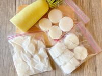 豚バラ肉を広げて②をのせ、手前から巻きます。同様に7個作り、表面に片栗粉をまぶします。