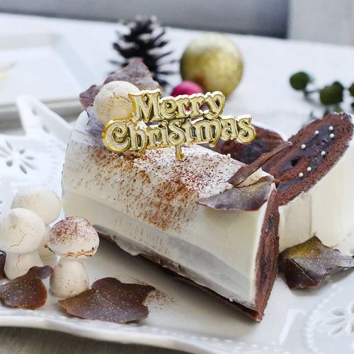9. クリームをスポンジの上にのせ、パレットで塗り広げます。端を斜めにカットし、お皿に盛り付け、お好みでメレンゲマッシュルームやチョコリーフをのせ、ココアパウダーをふったら完成です。