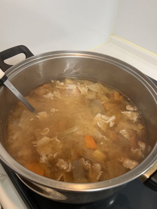 油が回ったら長ねぎ、こんにゃくを加えて軽く炒め、水、だしの素を加えて5〜6分煮ます。※途中でアクを取り除いてくださいね。