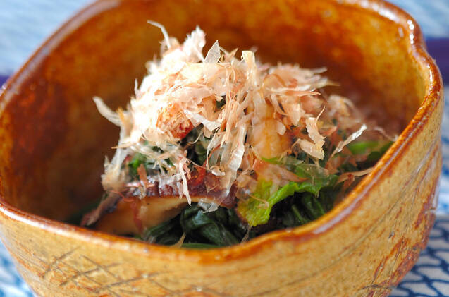 ほうれん草と焼きシイタケを使ったお浸しのレシピ。合わせダレにゆず汁を加えることで、さっぱりとした後味に。茹でたほうれん草を先に出汁に浸しておくことによって薄味に仕上げることができます。器に盛って、かつお節をふりかけたら完成♪菊の花やキノコなどを入れてみてもおいしくなるのでおすすめ!