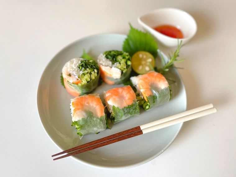 ライスペーパーで作るえび蒸し餃子は、もちもちした食感がおいしいひと品。タネにはえび以外にもはんぺんを加えるので、ふんわりとした仕上がりになります。ライスペーパーは皮がくっつきやすいため、蒸し焼きをするときは間隔をあけて並べるようにしましょう。