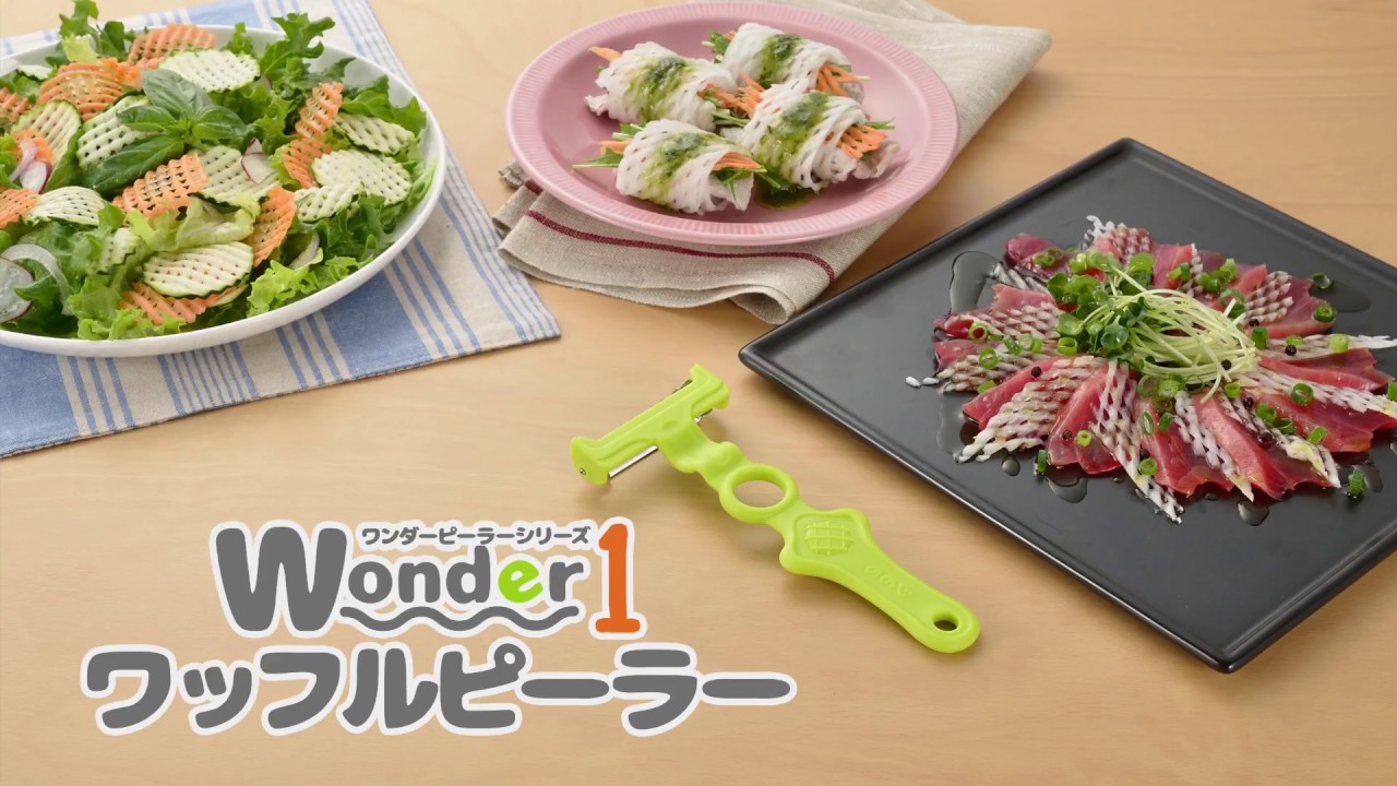 詳しい使い方は動画をチェック! ワッフルピーラーを使うと、固めの野菜や果物などを角度を変えて削るだけで網目状になるので、サラダの具材やお料理へのトッピング食材がグッと華やかに変身します。