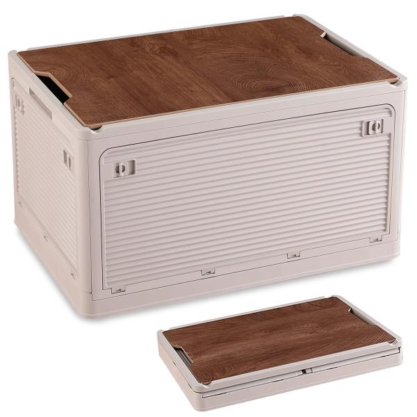 折りたたみ可能なプラスチック製の収納ボックス。上部と4つの側面をすべて開くことができ、物の出し入れがしやすいのがメリットです。木製の蓋を付ければ、上部をテーブルとして活用することも可能。スタッキングもできるので、拡張性が高いのもうれしいポイントです。