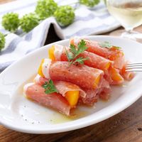 生ハムとメロンの組み合わせをパスタにアレンジします。メロンの甘味と生ハムの塩味がベストマッチ。メロンの芳醇な香りがとても上品です。スパゲッティは細いものを選び、しっかり水でしめてから和えましょう。水分が残っていると味がぼやけてしまうので気を付けてくださいね。