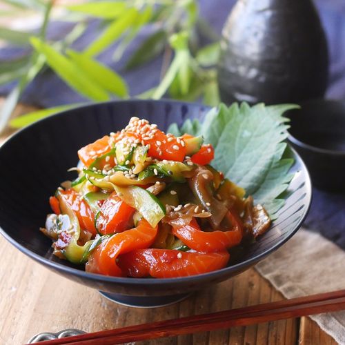サーモンのやわらかな食感と、きゅうり、ザーサイのシャキシャキの歯ごたえが絶妙なナムル。ピリッとする豆板醤が食欲を刺激します。サッと和えるだけでできあがるので、あとひと品足りないときやおつまみをすぐに出したいときにうってつけ。覚えておくと重宝しますよ。
